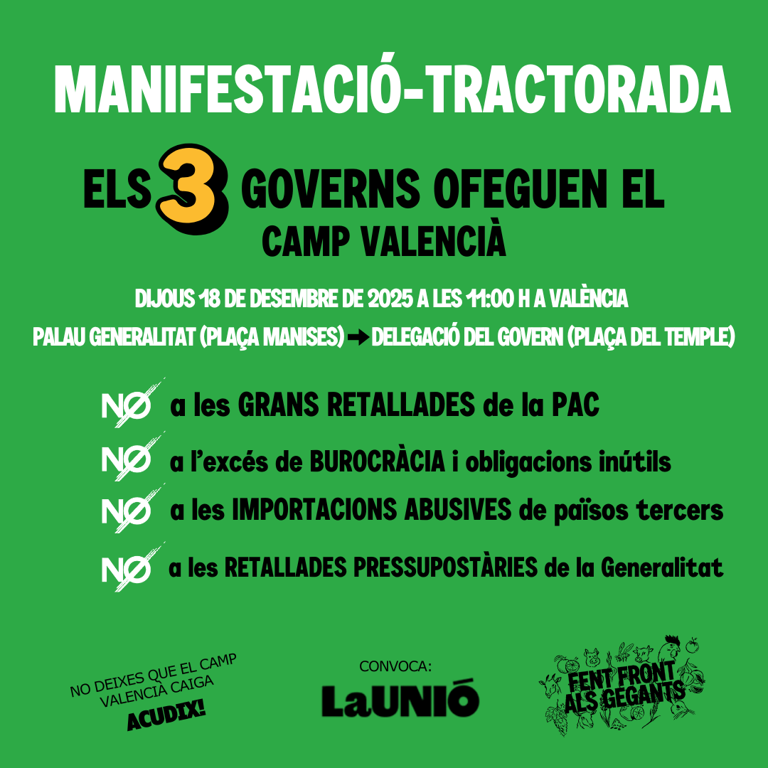 Demà, dijous 18 de desembre, Llauradors i ramaders de LA UNIÓ recorreran els carrers de València en una manifestació reivindicativa per denunciar que Comissió Europea, Govern d’Espanya i Generalitat “ofeguen al camp valencià amb les seues males polítiques agràries”.