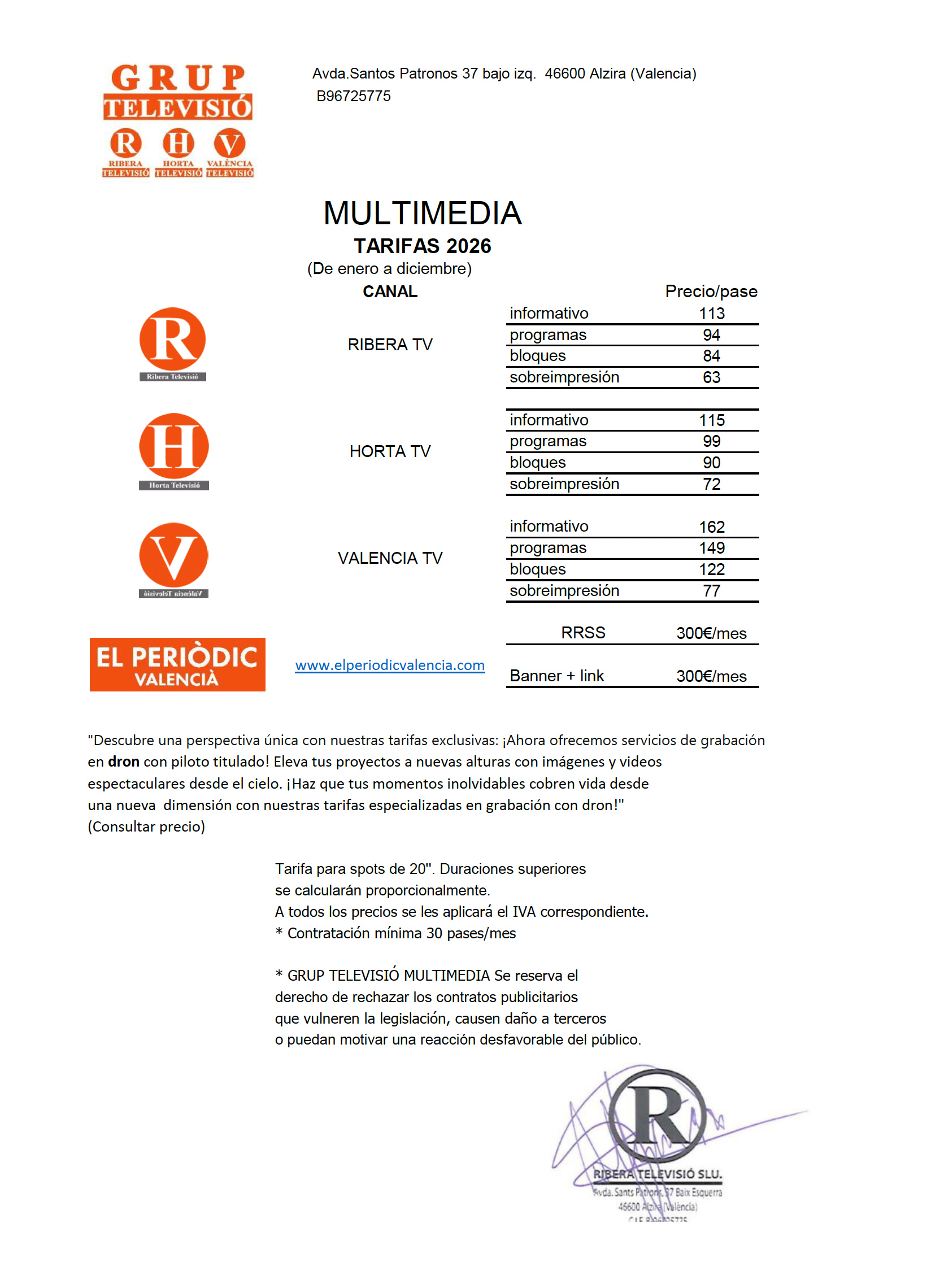 GRUP TELEVISIÓ es converteix en el vehicle publicitari ideal per a la seua empresa, ja que els tres canals que disposem: Ribera, Horta i València TV són televisions obertes al públic amb una àrea real de 2.350.000 habitants, dels quals un 22% d’ells, 517.000 persones reben la nostra emissió diàriament i de forma gratuïta,